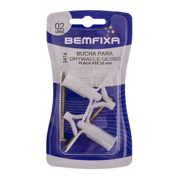 resumo: a bucha para drywall e gesso da bemfixa é a solução ideal para fixações seguras em superfícies de gesso e drywall de até 25mm de espessura. Com 2 unidades por pacote, proporciona uma maneira fácil e eficaz de pendurar objetos leves e médios em paredes frágeis, garantindo uma instalação firme e confiável.