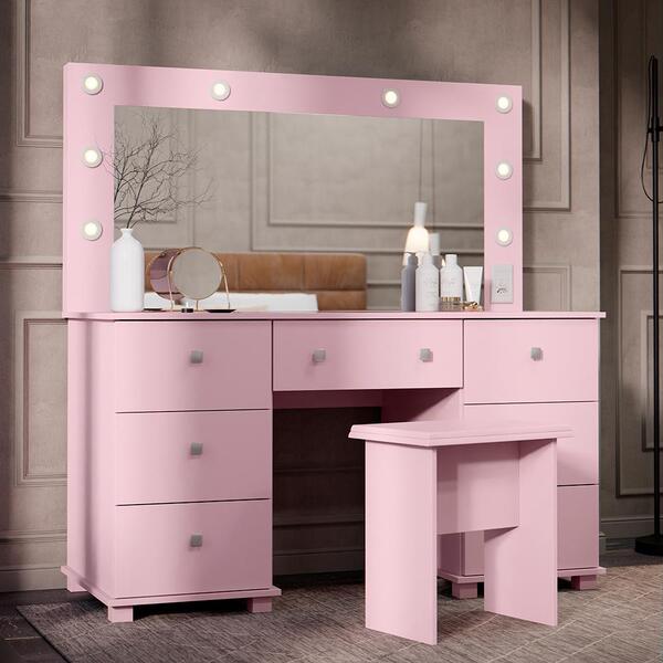A penteadeira é modelo desenvolvido especialmente para facilitar e organizar pertences de maquiagem e beleza, oferecendo um amplo espelho iluminado por leds, sete gavetas. Para garantir a qualidade do produto dentro da embalagem, as caixas são revestidas por um plástico termoincolhível e todas as peças são separadas por isomanta, tudo para preservar e evitar o atrito entre as peças dentro da embalagem. Você contará também com um manual com o passo a passo para auxiliar no momento da sua montagem. Feito em mdp/mdf. Não acompanha banqueta. Dimensão da penteadeira: altura: 144 cm largura: 136,5 cm profundidade: 48 cm informações da penteadeira: cor: rose material principal: mdp/mdf gavetas: sim, (7) espelho: sim. Leds: sim pés: sim, (8) módulo de tomada: sim itens inclusos: 1 penteadeira. Manual de montagem kit completo para montagem e manual de instruções garantia: 3 meses contra defeito de fabricação informações adicionais: - fotos meramente ilustrativas do produto no ambiente. - os objetos que ambientam as fotos não acompanham o produto; - verificar descrição e tamanho do produto antes da compra. - avaliar a mercadoria no ato do recebimento e recuse em caso de divergência ou avarias. - mantenha as informações de contato e endereço de entrega atualizados para entrarmos em contato caso necessário. - limpar com flanela ou pano macio seco, não utilizar produtos abrasivos, desengordurantes, álcool ou solvente. Não expor o produto diretamente à luz solar e à umidade. * sugerimos a contratação de um montador profissional para a montagem do produto. Não nos responsabilizamos por avarias causadas no ato da montagem. * não nos responsabilizamos pela montagem e desmontagem do produto no ato da entrega e devolução, assim como os custos gerados nestas situações. * a transportadora entregará o produto no andar térreo do endereço de entrega. * não nos responsabilizamos por subir escadas, corredores e elevadores ou transporte por guincho em apartamentos.