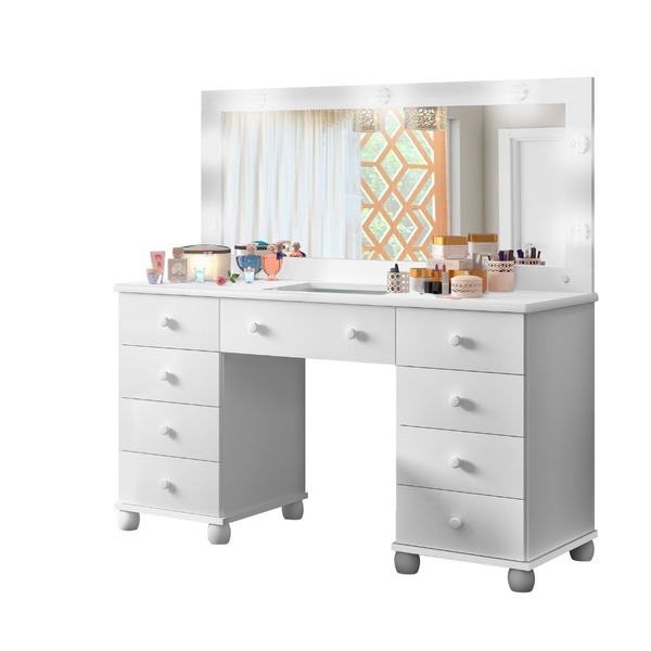 Penteadeira camarim 9 gavetas com espelho com led    descrição do produto   9 gavetas  1 gaveta colméia  corrediças telescópicas  pés e puxadores em madeiras produto 100% mdf led bivolts (110/220)   dimensões   altura: 1350 mm largura :1350 mm profundidade: 460 mm   atenção garantia de 3 meses  imagem meramente ilustrativa  não acompanha banqueta montagem por conta do comprador , a loja não oferece serviço de montagem produto acompanha kit e manual para montagem