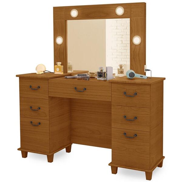Penteadeira camarim com espelho 00807601, é a escolha certa para organizar suas maquiagens e pertences, com muito estilo e modernidade. Estrutura com bases, tampos e quadro do espelho em mdf de 15 mm, e o restante em mdp de 15 mm, proporcionando resistência e mais durabilidade à peça, contando com pintura em acabamento uv. Composta por tampos espaçosos, perfeitos para deixar seus itens preferidos sempre à mão, amplo espelho iluminado por 4 leds, ideal para iluminar o rosto na hora de se maquiar, porta joias central com divisórias para seus utensílios e tampo de vidro para melhor visualização, 6 gavetas com corrediças telescópicas, que proporcionam um deslizar suave e ótimo espaço de armazenamento para seus objetos, conta com 7 puxadores retrô, tomada, entrada usb, interruptor, e 8 pés em madeira. Ganhe praticidade e charme na hora de se produzir. Este móvel chegará na sua casa separado em 04 volumes.dimensõesaltura 146 cmlargura 120 cmprofundidade 45 cmsistema de montagemparafusos, minifix e cavilhas.acompanha manual de montagem.recomendação de limpezalimpar com pano levemente umedecido com água, não utilizar produtos abrasivos. Não expor o produto diretamente à luz solar e à umidade.*objetos de decoração e banqueta não inclusos.importante saberas imagens são meramente ilustrativas, não acompanham objetos de decoração e eletrônicos.a tonalidade da cor do produto pode variar de acordo a calibração de cores do seu monitor, a iluminação do ambiente ou sua percepção visual.o cliente deve verificar a quantidade de volumes descritos na nota, as condições da embalagem, caso haja algum dano não assine o comprovante de recebimento e recuse a mercadoria.montagem, desmontagem e outras instalações serão de responsabilidade do cliente.não nos responsabilizamos por subir escadas/elevadores ou pelo transporte por guincho em apartamentos. Eventuais despesas são de responsabilidade do comprador.confira as dimensões do produto e certifique-se de que passarão normalmente por supostos elevadores, portas, escadas ou corredores de sua residência.o comprador ou a pessoa que receber os produtos deve verificar se os produtos recebidos correspondem ao mesmo modelo e à mesma quantidade dos produtos adquiridos, o entregador equivocado pode entregar volumes de outra carga.garantia de fábrica90 dias para eventuais defeitos de fabricação.