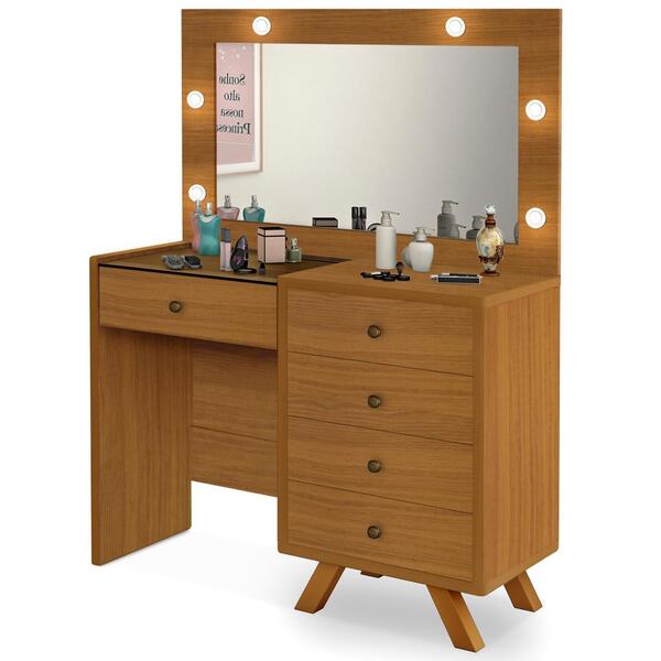 Penteadeira camarim com espelho 00809101, trata-se de um produto versátil, que une design moderno e minimalista à praticidade no dia-a-dia. Estrutura 100% mdf de 15 mm, 18 mm e 20 mm, proporcionando resistência e mais durabilidade à peça, contando com pintura em acabamento uv anti risco. Composta por tampo espaçoso, perfeito para deixar seus itens preferidos sempre à mão, amplo espelho de 3 mm, iluminado por 6 leds luz branca, ideal para iluminar o rosto na hora de se maquiar, 5 gavetas com corrediças telescópicas, proporcionando ótimo espaço de armazenamento para seus objetos, sendo a gaveta central com colmeia para armazenar joias e tampo de vidro 4 mm, para melhor visualização de seus pertences, conta com 5 puxadores em metal envelhecido, e 4 pés em madeira de reflorestamento. Tornando sua experiência na hora de se produzir, ainda mais especial. Este móvel chegará na sua casa separado em 04 volumes.dimensõesaltura 145 cmlargura 93,5 cmprofundidade 45 cmsistema de montagemparafusos, minifix e cavilhas.acompanha manual de montagem.recomendação de limpezalimpar com pano levemente umedecido com água, não utilizar produtos abrasivos. Não expor o produto diretamente à luz solar e à umidade.*objetos de decoração e banqueta não inclusos.importante saberas imagens são meramente ilustrativas, não acompanham objetos de decoração e eletrônicos.a tonalidade da cor do produto pode variar de acordo a calibração de cores do seu monitor, a iluminação do ambiente ou sua percepção visual.o cliente deve verificar a quantidade de volumes descritos na nota, as condições da embalagem, caso haja algum dano não assine o comprovante de recebimento e recuse a mercadoria.montagem, desmontagem e outras instalações serão de responsabilidade do cliente.não nos responsabilizamos por subir escadas/elevadores ou pelo transporte por guincho em apartamentos. Eventuais despesas são de responsabilidade do comprador.confira as dimensões do produto e certifique-se de que passarão normalmente por supostos elevadores, portas, escadas ou corredores de sua residência.o comprador ou a pessoa que receber os produtos deve verificar se os produtos recebidos correspondem ao mesmo modelo e à mesma quantidade dos produtos adquiridos, o entregador equivocado pode entregar volumes de outra carga.garantia de fábrica90 dias para eventuais defeitos de fabricação.