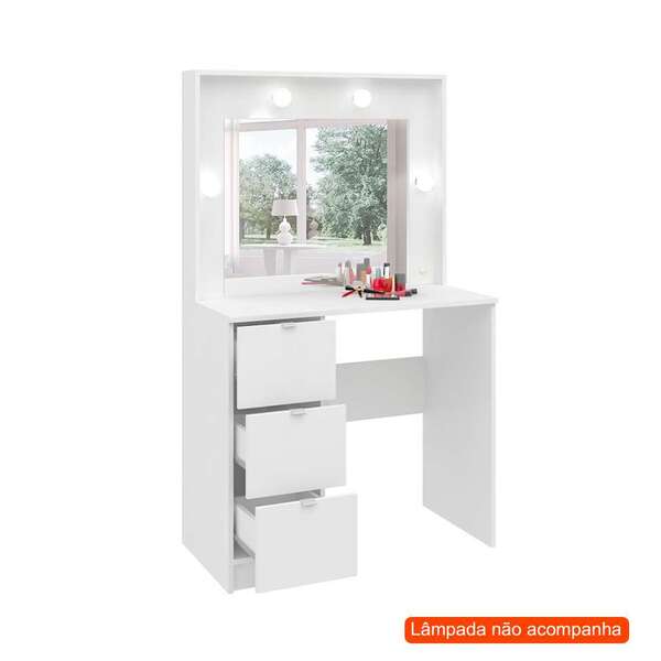 Que tal a penteadeira lis?na hora de garantir um espacinho pessoal onde você poderá guardar aqueles cosméticos e maquiagens mais amados, conte com a penteadeira lis. Com tampo amplo e gavetas para ajudar na organização, ela tem também um espelho para te ajudar a criar a make perfeita, ainda mais porque tem entradas bivolt para lâmpadas - é cômodo com ar de camarim que você quer? A cor branca facilita ainda a hora de combiná-la com o restante do mobiliário do quarto ou closet e compor o espaço dos seus sonhos sem perder o bom gosto e originalidade. Tudo de bom, né?