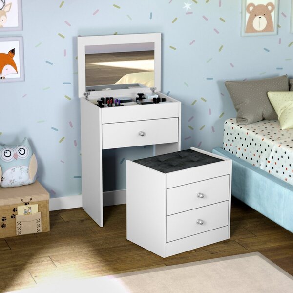 Penteadeira comoda 3 gavetas branco. A penteadeira cômoda mb 1011 da movelbento, é uma ótima opção para quem busca praticidade e conforto, possui espelho, divisor de gaveta e uma banqueta com rodízios, além de 3 gavetas. Compacto e extremamente funcional. Estilo: moderno pes...