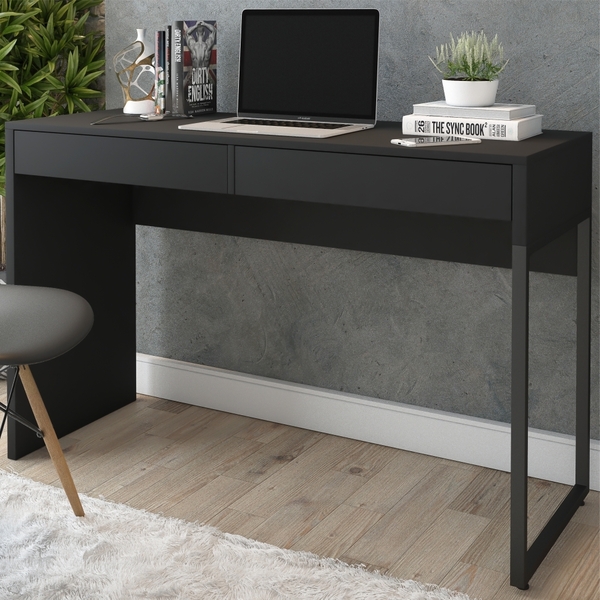 informações do produto: altura: 77,5 cm largura: 120 cm comprimento: 45 cm informações adicionais: cor: preto gaveta: sim (2) suporte para gabinete: não itens inclusos: 01 escrivaninha. kit completo para montagem, manual detalhado de instruções para montagem.