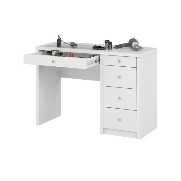 Penteadeira star 5 gavetas - brancomoderna, com várias gavetas, tampo com detalhe em vidro para que você possa organizar melhor seus adereços, tamanho maravilhoso, laqueada e entre outros detalhes para deixar tudo organizado.mdftrata-se de um painel de madeira reconstituída, produzido por meio da aglutinação de fibras de madeira com resinas sintéticas e aditivos. As placas de madeira são coladas umas sobre as outras com resina, e fixadas através de pressão. Empregado em partes aparentes dos móveis, onde serão aplicados acabamentos finais. Uma madeira que permite mais criatividade no design dos móveis, por isso é indicado em peças que terão partes arredondadas e contornos. O material também é recomendado em casos de usinagem em baixo relevo e entalhamento.características - cor: branco.- estrutura: mdf.- acabamento: laca.- 5 gavetas.- corrediças telescópicas.- peso suportado: 43kg.- marca: miller interiores.garantia: 3 meses.dimensõespeso: 22 kgaltura: 77 cm.largura: 110 cm.profundidade: 45 cm.outras informações- montagem não inclusa.- na limpeza não utilizar produtos químicos e abrasivos, usar apenas um pano umedecido, para garantir a maior durabilidade do móvel.- os objetos que ambientam as fotos não acompanham o produto.- imagens meramente ilustrativas. Cores e tonalidades podem variar.- antes de comprar o seu produto verifique as medidas, o local onde pretende instalar e se é necessário contratar o serviço de um profissional qualificado.