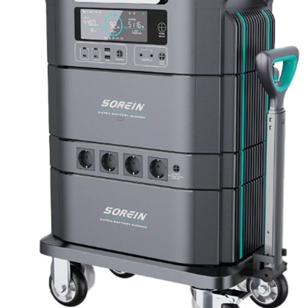 Bateria modular, formato a5, contendo uma controladora e um carrinho com bateria, a junção dos dois chega a 5.300w/h - mantém uma geladeira de 200l por aprox. 130 horas; se conectado a um painel solar, o próprio equipamento mantém a geladeira ligada independente da rede elétrica.