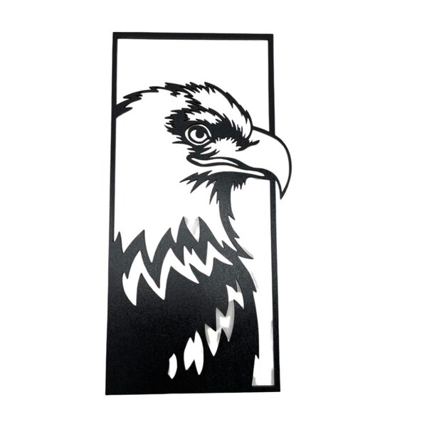Placas cortadas a laser em mdf, pintada na cor preta, tinta semibrilho, medindo: 31cm altura por 38 cm de largura. são formatos retrato vazado, com desenho: (cara de águia) dando um estilo único de uma beleza ímpar para decoração de interiores, de bares, restaurantes, bistrôs, residências e áreas de lazer.
