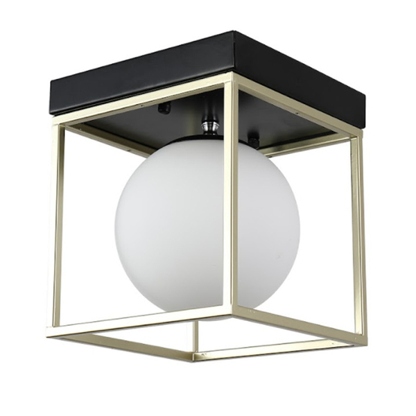Plafon Cubo Ouro Champagne e Preto Com Globo Branco Fosco e Soquete E27