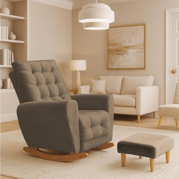 Poltrona amamentação base balanço cecilia a poltrona de balanço são feitas com materiais de alta qualidade, estrutura em madeira de eucalipto, o tecido suede macio e resistente, e a espuma d26 a densidade ideal para o seu conforto, base em madeira com um lindo design e balanç...