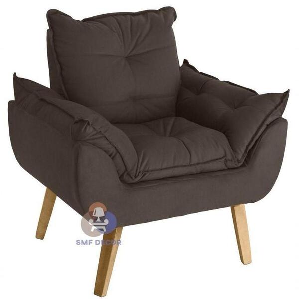 Poltrona decorativa opala marrom smf decorpoltrona opala agrega beleza e conforto. Produto com design moderno e luxuoso. Fabricada com produtos de altíssima qualidade, composto por pés quadrado de madeira de eucalipto, tecido sued veludo light, assento, encosto e braça com fi...