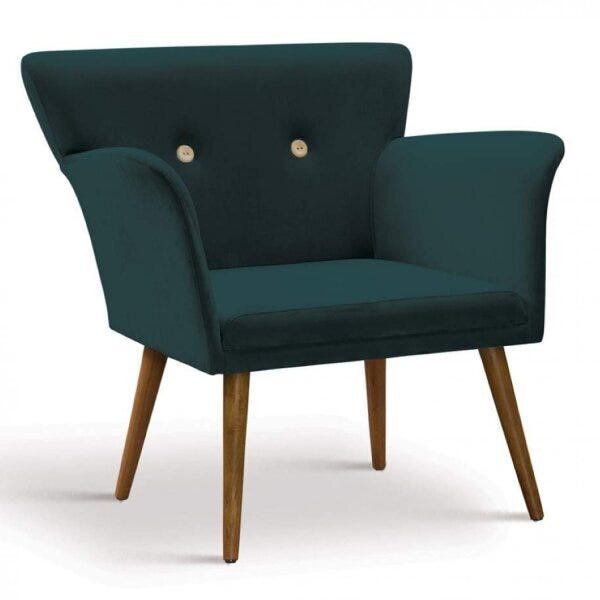 Poltrona retrô daf mobiliário verde. Poltrona retrô, fabricada em madeira de eucalipto, revestido com espuma d28 e tecido, detalhes em botões. Pés palito em madeira eucalipto. Produto com design retrô, ficará charmoso em qualquer tipo de ambiente. Estilo: retrô peso (kg): 14 ...