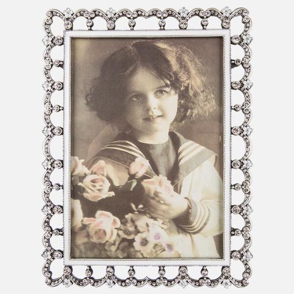 Porta-retrato em metal na cor prateada com aplicação de pedrarias.cor: prateado material: metal