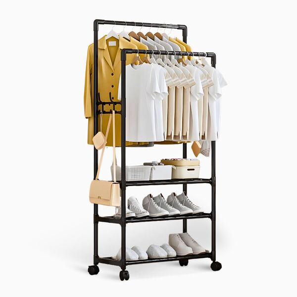 Apresentamos o cabideiro arara dupla com 3 prateleiras e rodinhas, uma solução elegante e funcional para otimizar a organização do seu ambiente com praticidade e estilo. Este cabideiro combina design moderno com versatilidade, ideal para manter suas roupas, acessórios e objetos pessoais organizados de maneira eficiente.