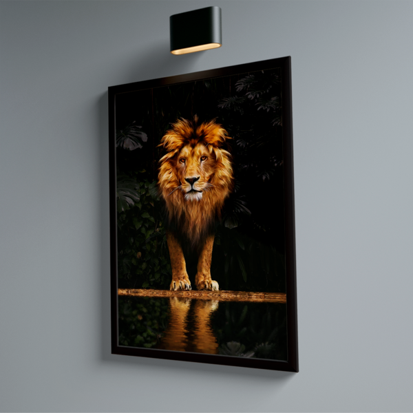 Quadro leão ouro forest m (84x54) c/ moldura preta - -qualidade premium (padrão museu) -impresso em canvas original com selo(tela de pintura) -alta durabilidade (durabilidade de mais de 30 anos) -alta resolução full hd 4k - 6 vezes mais leve que os quadros tradicionai...