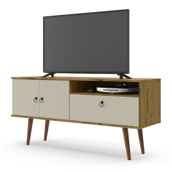 Rack topázio - nature e off white o rack topázio tem o estilo retrô, com linhas retas ele ainda conta com o conceito clean. Com duas portas ele mantém tudo o que você precisa guardar com muita discrição e organização em seu amplo espaço interno. Ainda possui um nicho e um amp...