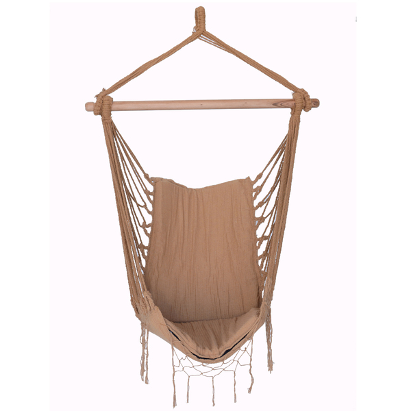 A rede de dormir é conhecida por proporcionar a sensação de relaxamento e descanso, não muito diferente da nossa rede cadeira.   a rede cadeira foi criada a partir dos tecidos da rede tradicional, entre duas camadas de tecidos colocamos espumas ortobom no assento e no encosto.   em suas laterais os mesmos punhos de uma rede tradicional , com quartoze pares de cordas 100% algodão trançados entre si, as cabeças por onde passam as cordas foram entrançadas manualmente, com uma acabamento manual em seu caseado , dando mais resistencia e qualidade aos trabalhos. Para que a rede se transforme em cadeira há um terceiro punho com três cabeças de carel feitos a mão, ainda acompanha um acessório de madeira.   dimensões: 1,35 m x ,60 mencosto: 0,50 m x 0,45 massento: 0.85 m x 0,45 mpeso: +/- 3.000 kg incluindo a madeiracapacidade máxima de carga: 120 kgcomposição do tecido: 100% algodãocomposição da espuma: 100 % polipropilenodistancia ideial entre o gancho e o piso : aprox 2,20       garantias:   prazo de validade é de tempo indeterminado. Nossas rede de descanso não mancham e nem soltam tinta desde que sejam lavadas de acordo com o manual que as acompanham. Pode haver uma diminuição ou esticamento de cerca de 5% do tamanho total devido à lavagem. Nossos produtos são pré-selecionados por uma equipe que atesta sua segurança e qualidade contra os defeitos de fabricação