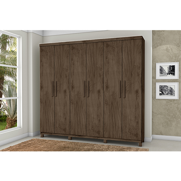 Roupeiro, 06 portas com 03 dobradiças de 35mm, 03 gavetas com corrediças telescópicas, espelho interno, cabideiro em alumínio, 08 pés de madeira maciça revestidos em poliestireno, produto em mdf. dimensões do produto: altura: 226cm largura: 245cm profundidade: 47cm pes...