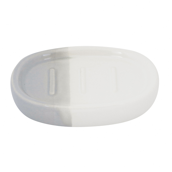 A Saboneteira Cerâmica Bab Sensea tem formato redondo e seu acabamento mescla as cores branco e cinza, tonalidades neutras que se adequam a qualquer decoração.
