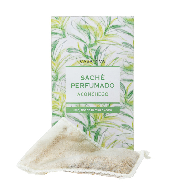 Este sachê tem uma fragrância denominada Aconchego, que une as propriedades aromáticas da lima, da flor de bambu e do cedro.