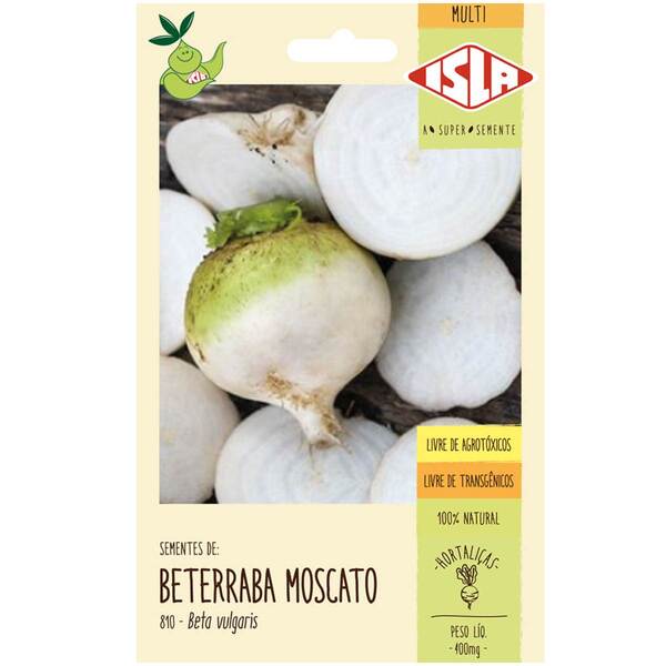 Sementes de beterraba moscato (branca) isla   descrição * nome científico: beta vulgaris l. * beterraba de coloração branca como a neve e arredondada.* possui um alto índice de açúcar, com o diâmetro de 5-10 cm.  * suas folhas são verdes claras e eretas.   característi...