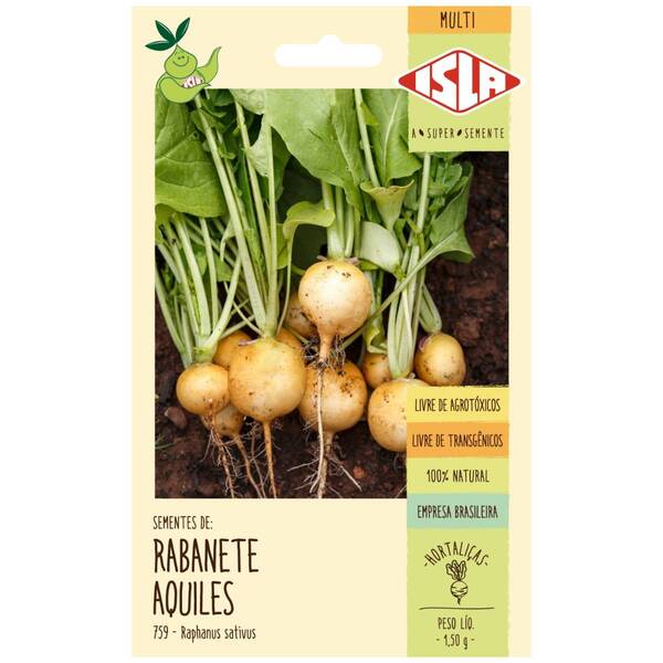 Sementes de rabanete aquiles (amarelo) isla   descrição* variedade redonda, do tipo globular. * raízes uniformes de coloração amarela brilhante. * pode ser cultivado facilmente em vasos e jardineiras.   características * germinação (dias) 4 a 10 dias. * ciclo verão (dias): 35 * ciclo inverno (dias): 40 * formato: redondo achatado * tipo das folhas: verdes * cor da casca: amarela * cor da polpa: amarela * diâmetro: 3 - 4 cm   informações/dicas/usos * tipo da embalagem: envelope multi * sementes por grama (aprox.): 115 * conteúdo do pacote: 1,50g   nós da cultiv.me trabalhamos desde 2013 para trazer os melhores produtos ao alcance de todos. Cultiv.me o verde que faltava!