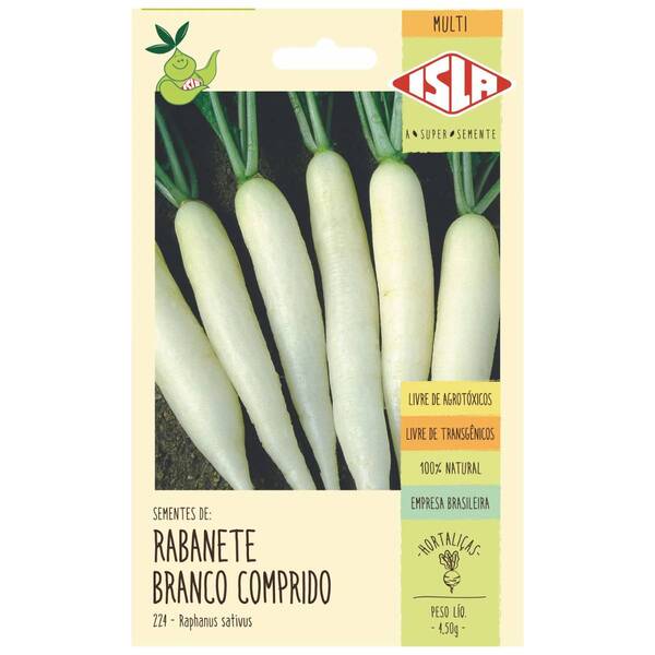 Sementes de rabanete branco comprido isla   descrição * variedade comprida de rabanete. * raízes cilíndricase e levemente onduladas de coloração branca. * melhor adaptação em temperaturas amenas e frias.   características * germinação (dias) 4 a 10 dias.   informações/dicas/usos * tipo da embalagem: envelope multi * sementes por grama (aprox.): 105 * conteúdo do pacote: 4,50g   cultiv.me trabalha desde 2013 para trazer os melhores produtos de jardinagem ao alcance de todos. acreditamos que cuidar da natureza deve ser acessível para todos. cultiv.me o verde que faltava.