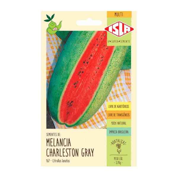 Melancia charleston gray   descrição * frutos alongados de coloração verde-claro com listras verde-escuras. * variedade altamente doce e muito produtiva. * excelente uniformidade de frutos.   características * peso 10 a 18 kg * germinação (dias) 5 a 14 * nº aproximado de sementes / g 11 * conteudo do pacote 3,7g   informações/dicas