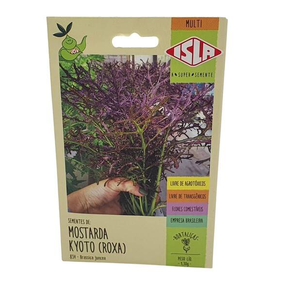 Sementes mostarda crespa roxa (kyoto) isla   descrição * planta vigorosa, folhas serrilhadas de coloração roxa intensa e levemente esverdeado no centro.   características * comprimento ou altura 30 - 40 cm * peso 160 g * germinação (dias) 5 - 7   informações / dicas   * tipo de embalagem: envelope (multi) * sementes por grama (aprox.): 575 * conteúdo do pacote: 1,3g