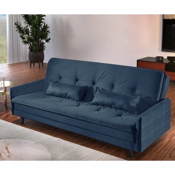 Sofá cama 3 lugares tokio azul. Este sofá cama acomoda tranquilamente 3 pessoas sentadas e duas deitadas, ele pode ser utilizado em 02 posições diferentes, espumas de alto conforto com a densidade tanto no assento como no encosto espuma d-26, com percinta elástica , pés em madeira e base em aço, acompanha 2 almofadas que podem ser usadas como travesseiro estilo: moderno peso (kg): 61 garantia: 06 meses altura (cm): 91 largura (cm): 204 possui baú: não possui pés: 4 pet friendly: não tipo de mola: não possui tipo de sofá: sofás cama altura dos pés: 13 modelo do sofá: somente reclinável possui rodízio: não suporta até (kg): 150 estilo de braço: braços redondos profundidade (cm): 95 tipo de assento: fixo tipo de encosto: fixo material dos pés: eucalipto altura do encosto: 55 nível de conforto: intermediário origem do produto: nacional rodízio com trava: não ambiente principal: sala de estar quantidade de itens: 1 tecido predominante: veludo densidade do assento: d-26 densidade do encosto: d-26 enchimento do assento: espuma enchimento do encosto: espuma material da estrutura: madeira eucalipto quantidade de lugares: 3 serviço impermeabilização: 102610509 acompanha almofadas extras: não possui percintas elásticas: sim altura do assento até o chão: 36 informações complementares (novo): lavagem a seco. Fabricante: luxury estofados marca: luxury estofados cor: azul cor do produto: azul itens inclusos: 1 sofá cama, 4 pés e 2 almofadas decorativas. Cor predominante: azul linha ou coleção: sofá cama medida como cama (a x l x p): 36 x 204 x 124