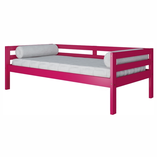 Sofá cama rosa produzido com madeira maciça pinus, proveniente de reflorestamento dando mais resistência e durabilidade ao seu produto. A pintura em laca fosco é de excelente qualidade e resistente a riscos, apresentando um ótimo acabamento final ao produto. Seu design rústico o torna mais elegante e bonito, devido a utilização de colchão padrão solteiro, ele é bastante espaçoso podendo ser utilizado confortavelmente como sofá ou como uma cama.