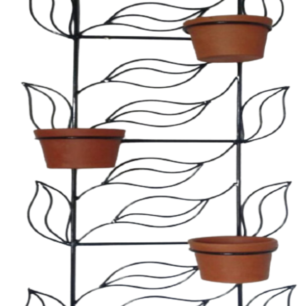 Suporte para plantas folhas, para fixação em paredes interno ou externo. Acomoda 5 vasos. Vasos e flores não acompanham o produto, somente ilustrativo. Pintura eletrostatica preto. Altura: 100.00 cm largura: 18.00 cm comprimento: 40.00 cm peso: 2000 g suporte de ferro para vasos