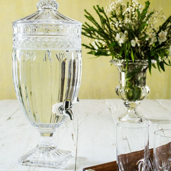 A suqeira ou dispenser da marca brandon wolf faz a diferença   não pode faltar em sua residencia ou festa. Coloque água e monte sua propria bedida com frutas. Dispenser para bebidas em cristal. Linha brandon. Possui tampa com puxador e pé quadrado. Modelo ornamentado com relevo.   tamanho: 51cm de altura com a tampa x 18 cm de diâmetro capacidade 4 litros   cuidados:   - lavar somente com detergente neutro e esponja macia. Secar imediatamente após a lavagem; - não lavar em máquinas; - para realçar o brilho utilize flanela branca e álcool líquido. - não passar álcool na torneira.