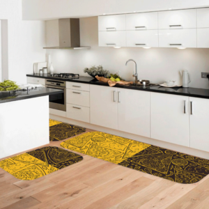 Em relação à decoração, o tapete de cozinha deve ser harmonizado com os demais móveis e objetos. Se os armários e eletrodomésticos são escuros, opte por tapetes neutros e com estampas de uma única cor.