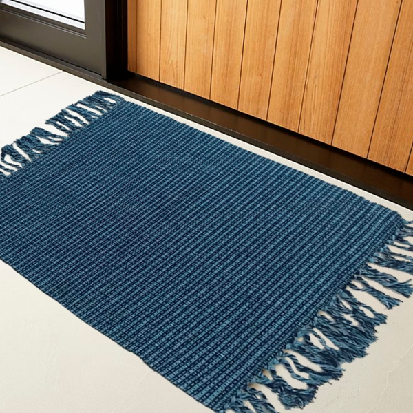 O azul de lavagens jeans do tapete o torna jovial e elegante para ambientes modernos. Este tipo de material permite o uso em ambientes com grande circulação. Ele pode recepcionar suas visitas na porta do apartamento ou na entrada da sala de estar, por exemplo.