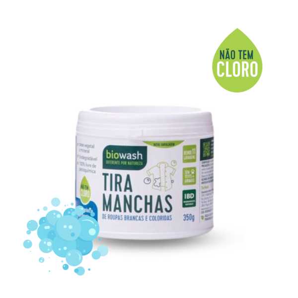 Produto tira manchas. biodegradável, sem cloro, sem fosfatos, sem fragrância e sem branqueador óptico. 350gr modo de usar: lavagem a máquina: utilize 1 colher de sopa cheia (30gr) junto com o detergente. Pra roupas muito sujas, utiliza 2 colheres de sopa cheias (60gr) tira m...