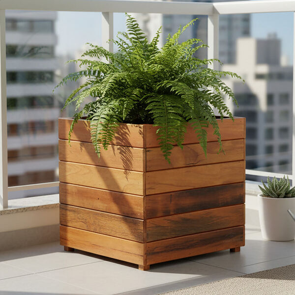Ideal para jardins verticais ou hortas em espaços compactos, o cachepot 50x50cm é feito 100% em madeira maciça com acabamento em verniz especial, garantindo alta durabilidade, resistência e estilo rústico elegante. Perfeito para ambientes internos ou externos, transforma qualquer cantinho com charme e praticidade.   madeira maciça: (pode variar entre madeira mogno e eucalipto, conforme disponibilidade de estoque) ficha técnica do produto: altura: 50 cm; largura: 50 cm; comprimento: 50 cm; obs. A cor pode variar da foto conforme a sombra da madeira e da iluminação. Consulte as medidas do produto antes de realizar a compra, para evitar imprevistos no momento da entrega. Nossas entregas não incluem subida de escadas, elevador ou içamento de produtos e entrega em determinadas áreas rurais.