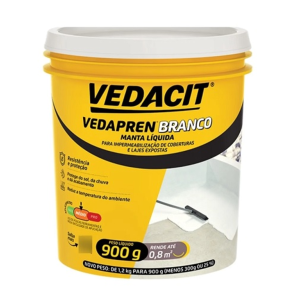 Informações vedacit vedapren branco é uma manta líquida de base acrílica e aplicação a frio sem emendas pronta para uso e moldada no local. Cobre a estrutura com uma proteção impermeável e apresenta ótimas características de elasticidade flexibilidade e aderência tendo uma grande durabilidade e alta resistência às intempéries. Proporciona excelente acabamento além de refletir os raios solares o que reduz parte do calor absorvido pela estrutura. Vedacit vedapren branco dispensa proteção contra os raios solares. campos de aplicação :: lajes expostas :: estruturas inclinadas como lajes abóbadas sheds cúpulas e marquises :: telhas onduladas :: calhas de concreto preparo do substrato em lajes regularizadas: o concreto deve estar limpo seco sem impregnação de produtos que prejudiquem a aderência como desmoldantes graxa agentes de cura química óleo tintas entre outros. Examinar antes se na regularização há trincas que venham a exigir um reforço local na impermeabilização. preparo do produto produto pronto para uso. Misturar o produto antes da aplicação utilizando ferramenta limpa a fim de evitar a sua contaminação. dados técnicos :: densidade: 1 28 g/cm³ :: aparência: branco(a) :: composição básica: copolímero acrílico em dispersão aquosa :: consumo aproximado: 1 2 kg/m² (em 3 demãos) :: rendimento: pote de 900g: até 0 8m² :: peso líquido: 0 90kg :: peso bruto: 0 95kg.